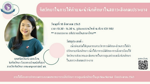 เรียนเชิญเข้ารวมรับฟังการบรรยาย อภิปราย กิจกรรมการอบรมบทบาทอาจารย์ที่ปรึกษา การดูแลนักศึกษาในยุค New Normal ในหัวข้อ “จิตวิทยาการให้คำแนะนำนักศึกษาในสภาวะสังคมเปราะบาง”  โดยมีวัตถุประสงค์ส่งเสริมให้บุคลากรสายวิชาการมีทักษะด้านการให้คำปรึกษาแก่นักศึกษา เพื่อให้อาจารย์มีทักษะการสื่อสารโดยใช้จิตวิทยาเชิงบวกและมีบทบาทในการดูแลช่วยเหลือนักศึกษาในสภาวะสังคมเปราะบาง