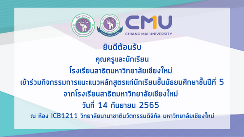 ยินดีต้อนรับ คุณครูและนักเรียน โรงเรียนสาธิตมหาวิทยาลัยเชียงใหม่ เข้าร่วมกิจกรรมการแนะแนวหลักสูตรแก่นักเรียนชั้นมัธยมศึกษาชั้นปีที่ 5 จากโรงเรียนสาธิตมหาวิทยาลัยเชียงใหม่