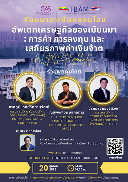 สัมมนาอาเซียนออนไลน์ ในหัวข้อ “อัพเดทเศรษฐกิจของเมียนมา: การค้า การลงทุน และเสถียรภาพค่าเงินจ๊าต”
