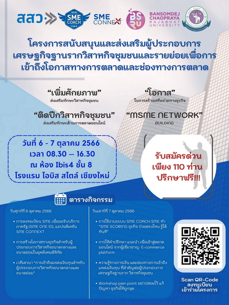 จัดกิจกรรมสัมมนาและอบรมเชิงลึกสำหรับผู้ประกอบการรายย่อย และวิสาหกิจชุมชน ภายใต้โครงการสนับสนุนและส่งเสริมผู้ประกอบการเศรษฐกิจฐานรากวิสาหกิจรายย่อยเพื่อการเข้าถึงโอกาสทางการตลาดและช่องทางการตลาด