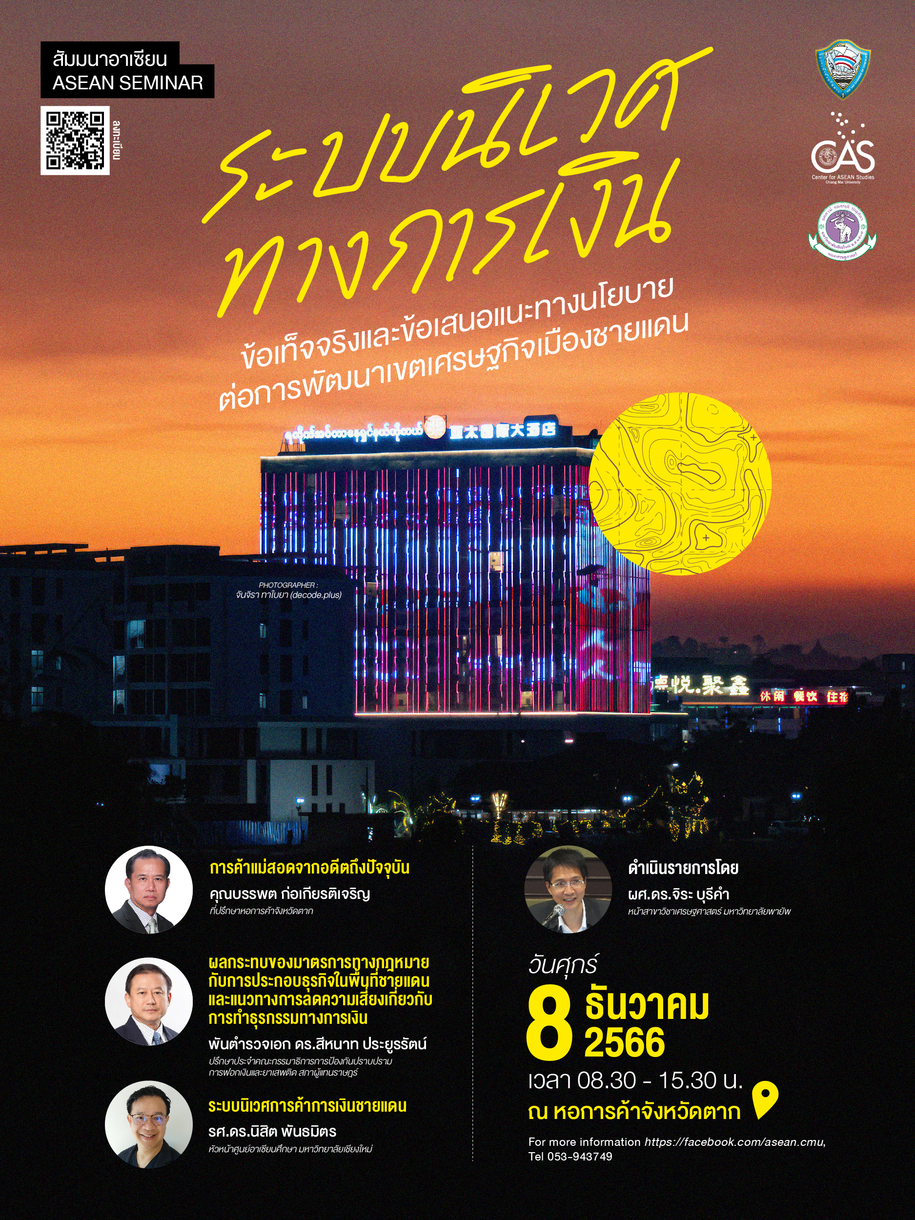ศูนย์อาเซียนศึกษา มหาวิทยาลัยเชียงใหม่ ร่วมกับ หอการค้าจังหวัดตาก และคณะเศรษฐศาสตร์ ขอเชิญผู้ที่สนใจเข้าร่วมงานสัมมนาทางวิชาการอาเซียนศึกษา ASEAN Seminar ในหัวข้อ “ระบบนิเวศทางการเงิน: ข้อเท็จจริง และข้อเสนอแนะทางนโยบายต่อการพัฒนาเขตเศรษฐกิจเมืองชายแดน”