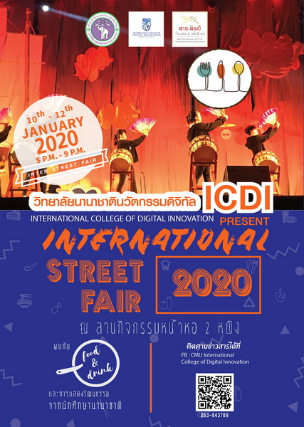 วิทยาลัยนานาชาตินวัตกรรมดิจิทัล มหาวิทยาลัยเชียงใหม่ เชิญชวนร่วมกิจกรรม International Street Fair 2020 จัดร่วมกับงานสานศิลป์ กิ๋น แอ่ว อู้ ในวันที่ 10 - 12 มกราคม 2562 เวลา 17.00 น. – 21.00 น. ณ ลานกิจกรรมหอหญิง 2 มหาวิทยาลัยเชียงใหม่ พบกับบูธจำหน่ายอาหารนานาชาติ บริเวณด้านขวาของเวที และพบกับการแสดงจากนักศึกษาต่างชาติจากประเทศต่างๆ ในวันที่ 10 มกราคม 2563 เวลา 17.55 -19.30 น.